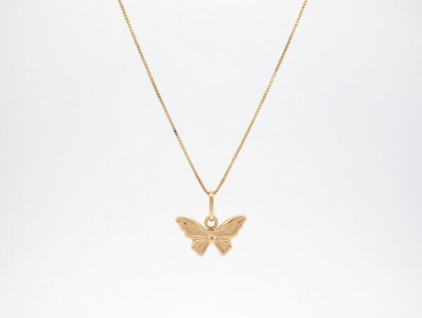 Grace your neckline with this delicate 18K yellow gold butterfly pendant. Meticulously crafted with smooth, high-polish surfaces and fine detailing on the wings, this charming pendant captures light beautifully with every movement.