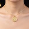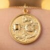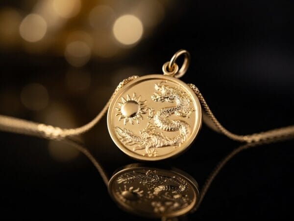 Command attention with this bold yet refined 18K yellow gold pendant. The centerpiece showcases a detailed Chinese dragon coiled around a glowing sun — a powerful symbol of strength, prosperity, good fortune, and positive energy.
