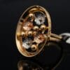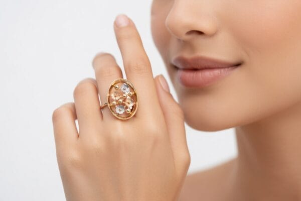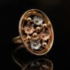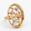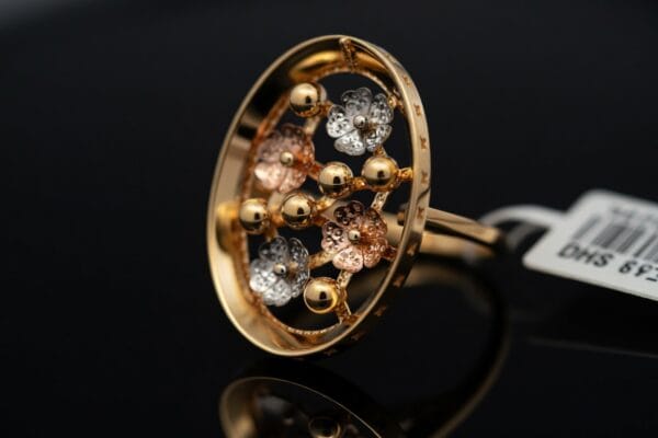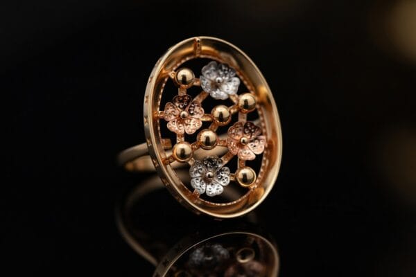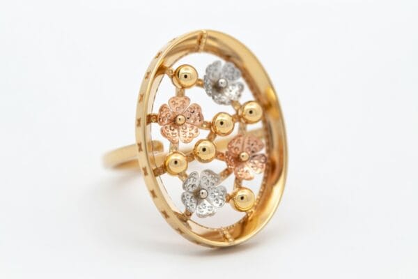 This exquisite 18K gold ring showcases a delicate yet eye-catching floral design with flowers crafted in warm yellow gold, soft rose gold, and cool white gold. The flowers beautifully emerge from an open circular frame, creating beautiful depth and dimension with every angle.