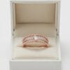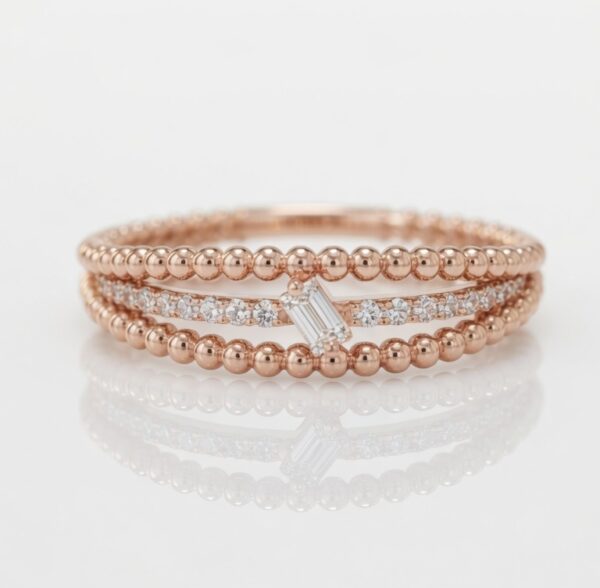 A charming and feminine ring that combines modern texture with subtle sparkle. This 18K rose gold ring showcases a beautiful beaded design along the band, highlighted by a central baguette-cut diamond and a pavé diamond row for added brilliance.