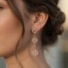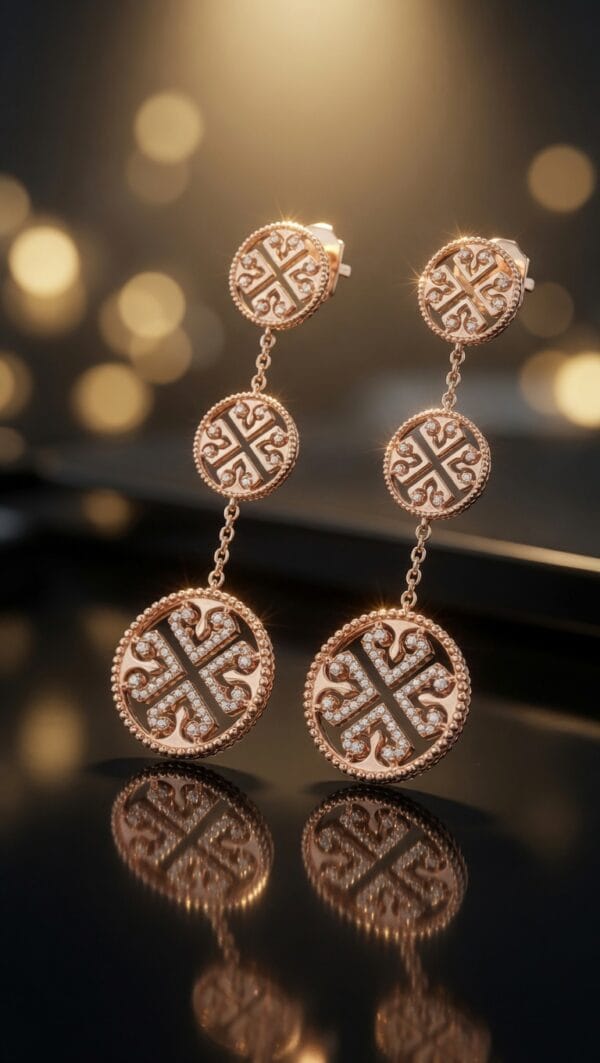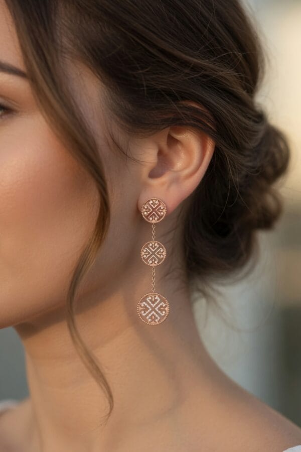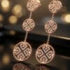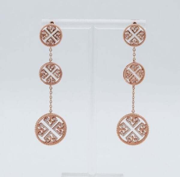 A beautiful blend of classic elegance and contemporary craftsmanship. These 18K rose gold earrings showcase three tiers of delicately pierced circular medallions, each adorned with sparkling pavé-set natural diamonds. The openwork pattern creates a light, airy feel while the warm rose gold adds richness and sophistication.