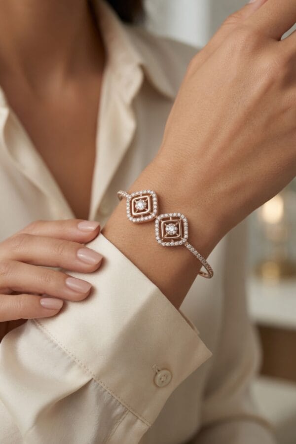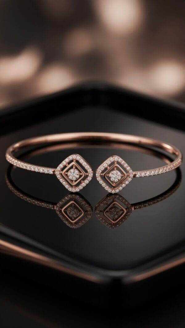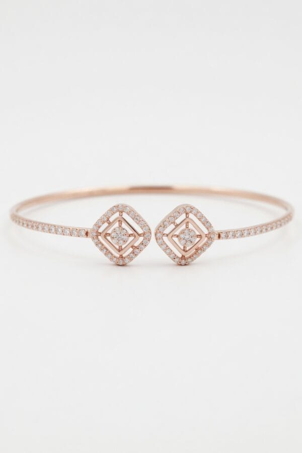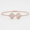 A harmonious blend of contemporary design and timeless brilliance. This elegant 18K rose gold bangle showcases two beautifully crafted square geometric elements, each adorned with a central diamond cluster surrounded by a double pavé halo. The slender band is lined with additional sparkling diamonds, creating a continuous flow of light.