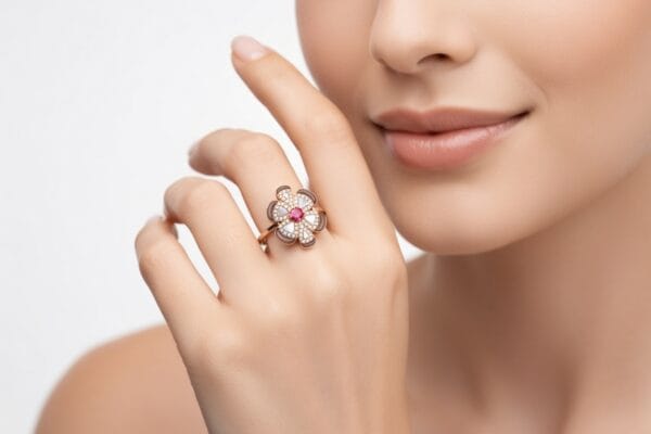 A romantic and artistic statement ring that combines classic floral elegance with modern gemstone craftsmanship.