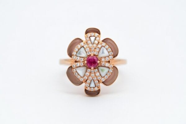 This exquisite 18K rose gold ring is designed in a beautiful blooming flower motif. A rich round ruby sits proudly at the center, encircled by delicate triangular mother-of-pearl inlays and sparkling pavé diamonds. The outer petals feature warm brown enamel that beautifully complements the rose gold, creating a sophisticated and eye-catching piece.
