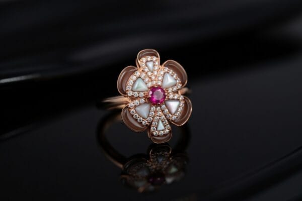 HomeShopDIAMOND JEWELLERIESRINGS18K Rose Gold Floral Ruby & Mother of Pearl Ring