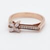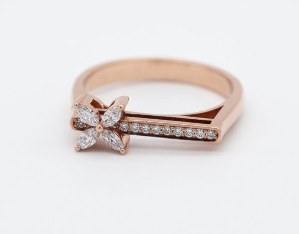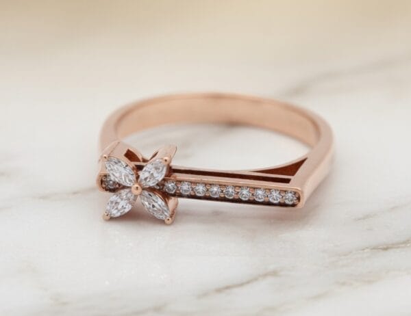 A feminine and romantic ring that captures the beauty of blooming flowers. This 18K rose gold ring showcases a charming flower motif crafted with sparkling marquise-cut diamonds at the center, complemented by a pavé diamond bar on the band for added brilliance.