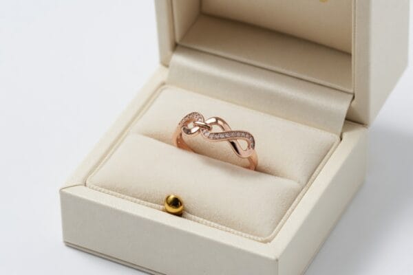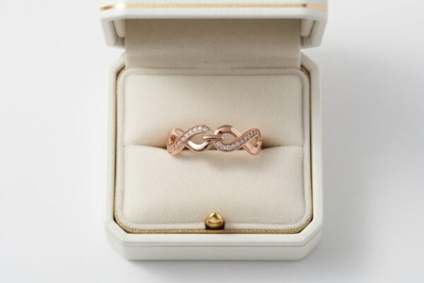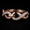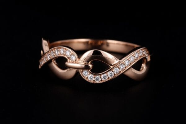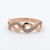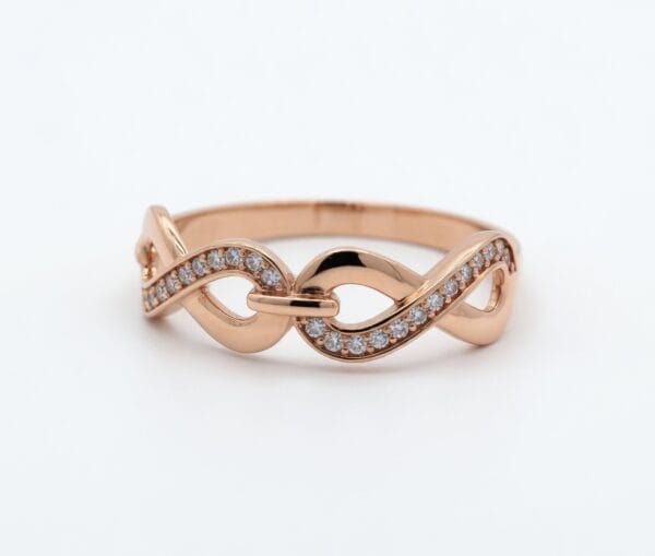 A modern classic that captures the essence of eternal connection. This 18K rose gold ring showcases a graceful infinity (figure-eight) motif with a sleek interlocking design, beautifully accented by pavé-set round brilliant diamonds along the curves for continuous sparkle.
