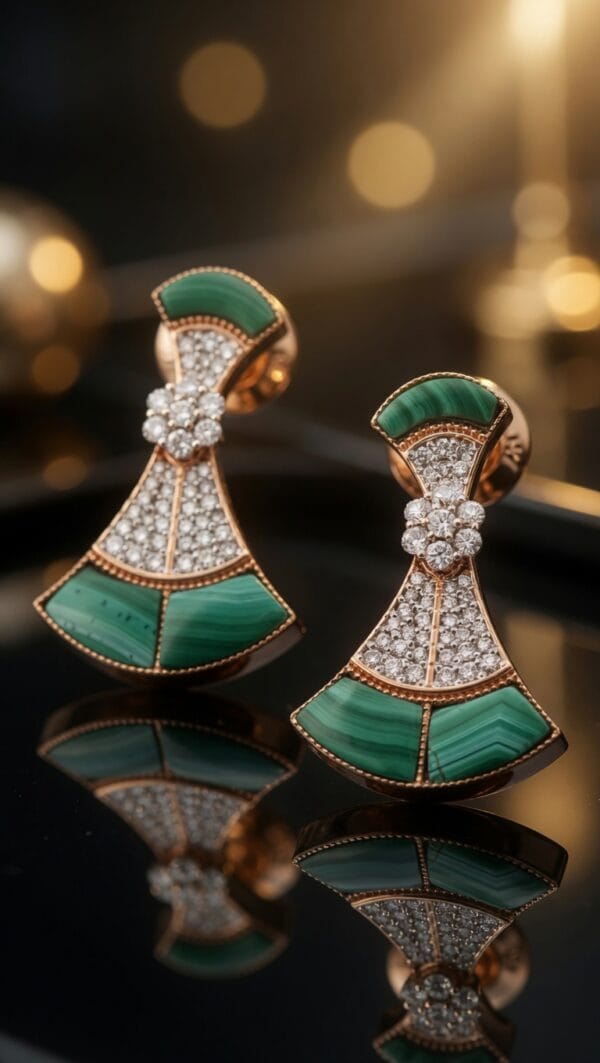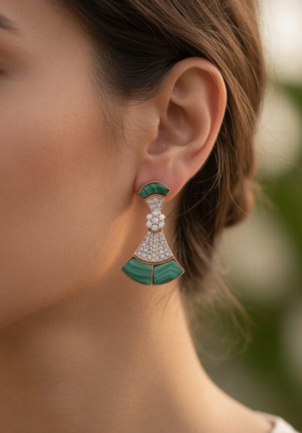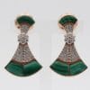 A striking fusion of color and brilliance. These 18K rose gold earrings showcase a beautiful fan-shaped design with rich green malachite panels elegantly framed by pavé-set natural diamonds. A central diamond cluster adds extra sparkle and dimension to the piece.