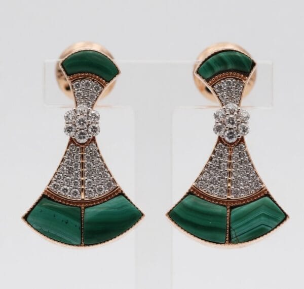 Weighing a comfortable 7.13 grams per pair, the earrings offer substantial presence while remaining wearable. The warm rose gold beautifully complements the deep green tones of the 3.55 ct malachite and the fiery sparkle of the 0.78 ct natural diamonds.