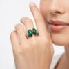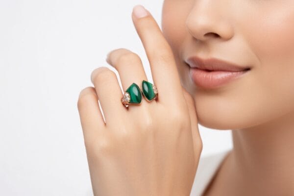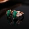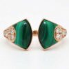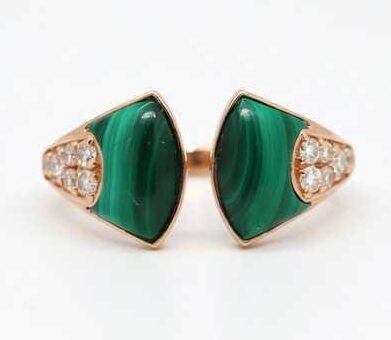 This striking 18K rose gold ring showcases two eye-catching shield-shaped deep green malachite stones with beautiful natural banding. The rich green malachite is beautifully complemented by sparkling natural diamonds (0.14 ct total) set on both sides, creating a perfect balance of color and brilliance.