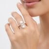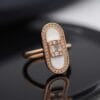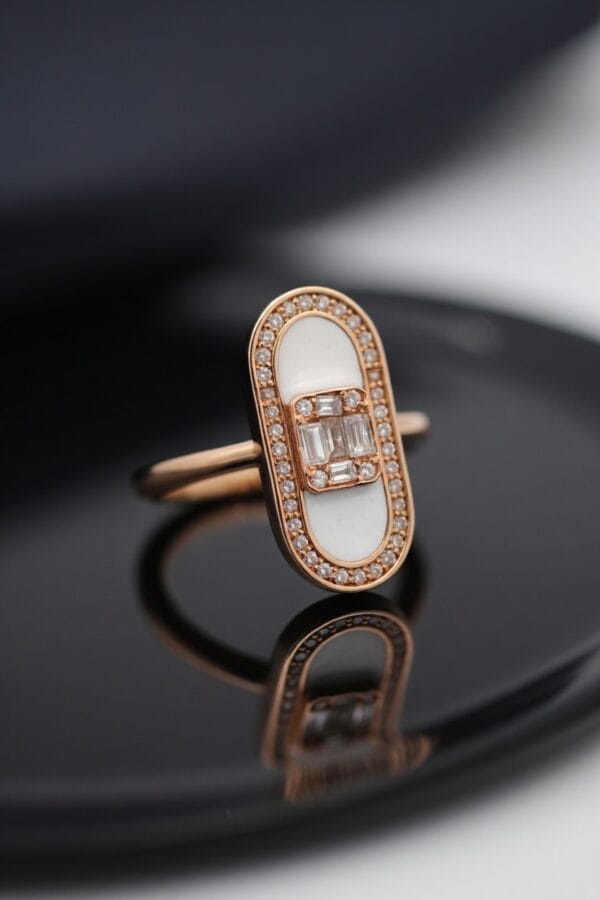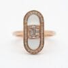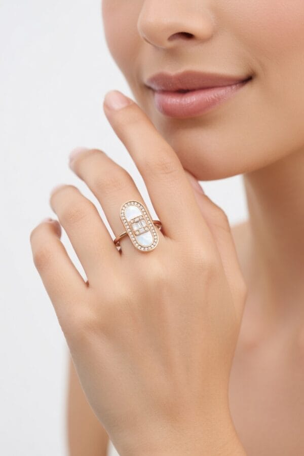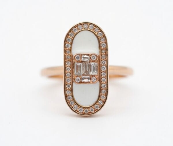 This refined 18K rose gold ring showcases a sleek elongated oval silhouette centered with a smooth white mother-of-pearl inlay. A sparkling cluster of baguette and round diamonds sits elegantly in the middle, framed by a full pavé diamond border that adds continuous brilliance around the oval.