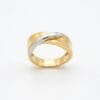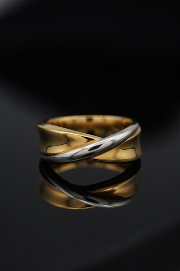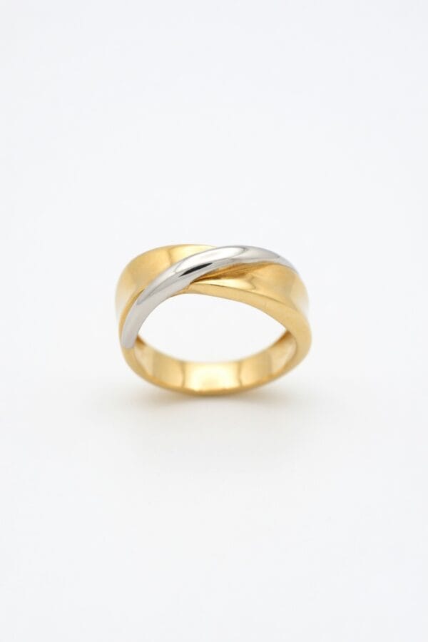 This sophisticated 18K two-tone gold ring features a sleek twisted design where warm yellow gold and cool white gold elegantly intertwine. The smooth, flowing curves create a modern yet classic look with beautiful contrast and dimension.