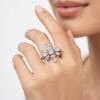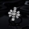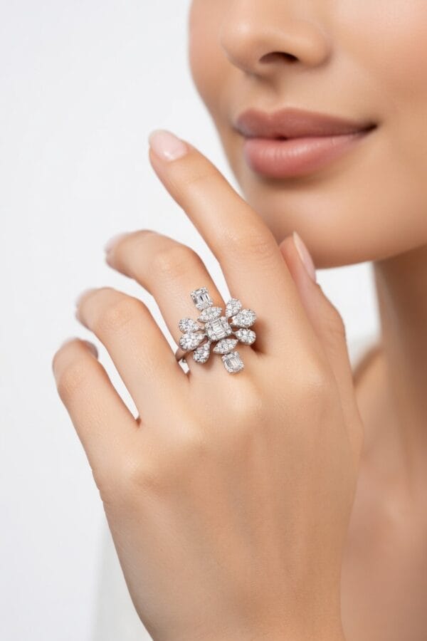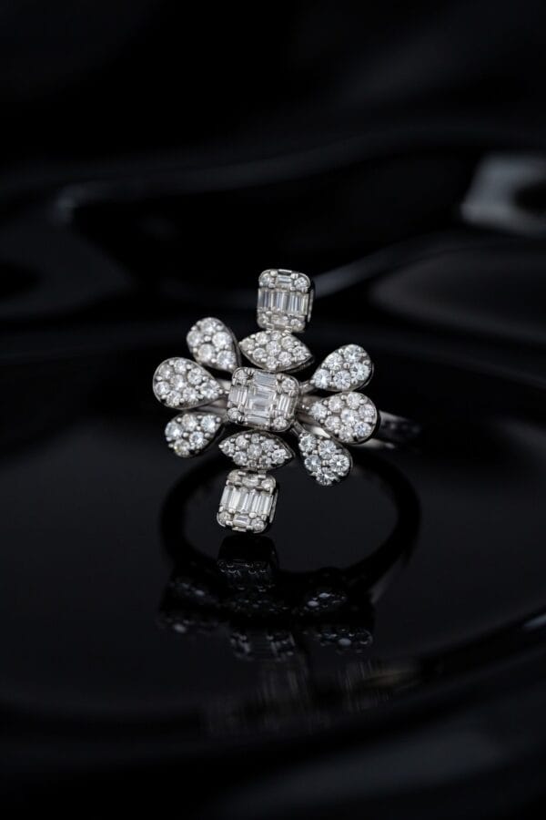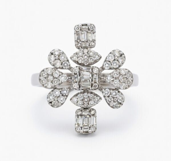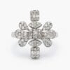 This sophisticated 18K white gold ring showcases a beautifully symmetrical cross design with a central rectangular motif surrounded by pavé-set diamonds and teardrop-shaped diamond clusters. The design is elegantly accented with baguette diamonds at the top and bottom, creating a refined floral-cross appearance.