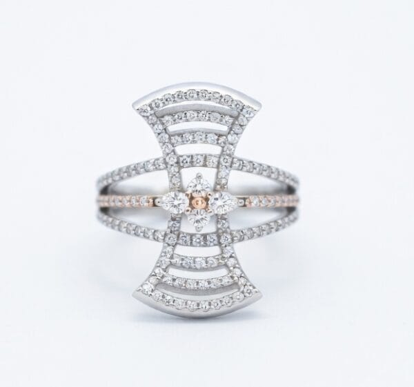 This exquisite 18K white gold ring showcases a delicate multi-layered fan-shaped design with intricate openwork. The fan is fully encrusted with sparkling pavé diamonds (1.04 ct total) across several elegant layers, centered around a brilliant diamond cluster accented with fancy diamonds (0.15 ct).
