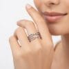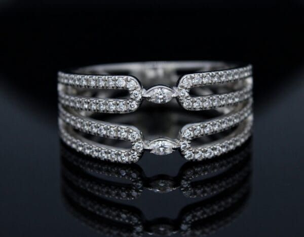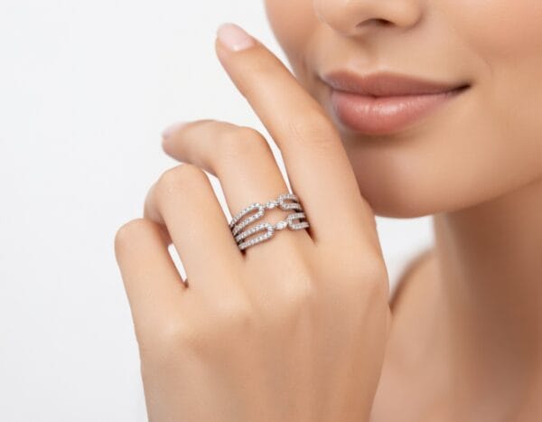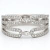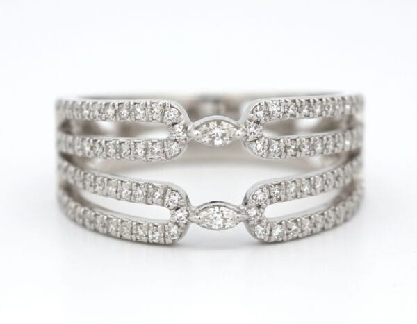 This refined 18K white gold ring features a striking multi-row design with three parallel pavé diamond bands elegantly linked by marquise and round brilliant diamonds. The interconnected structure creates beautiful movement and maximum sparkle from every angle.
