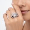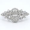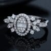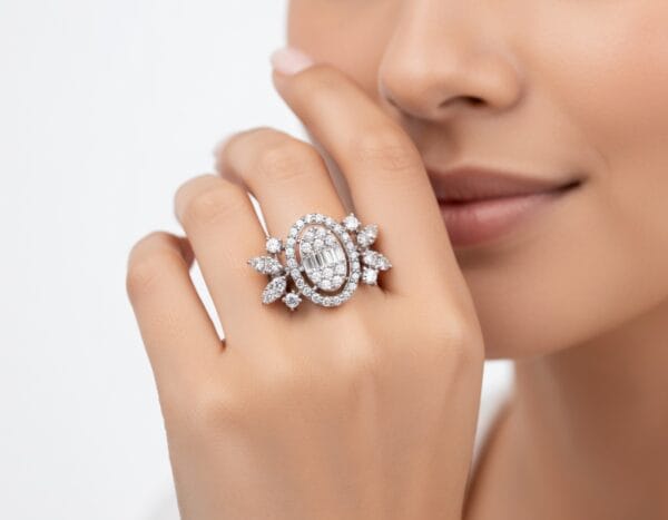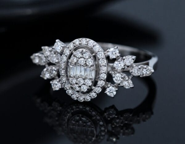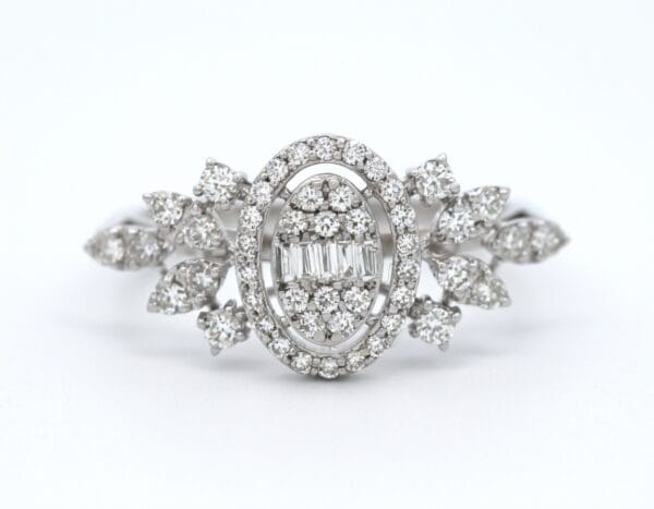 This sophisticated 18K white gold ring showcases a beautifully crafted oval design with a central cluster of baguette and round brilliant diamonds, encircled by a sparkling pavé halo. Delicate leaf and vine motifs with marquise and round diamonds extend gracefully on both sides, creating a romantic and balanced look.