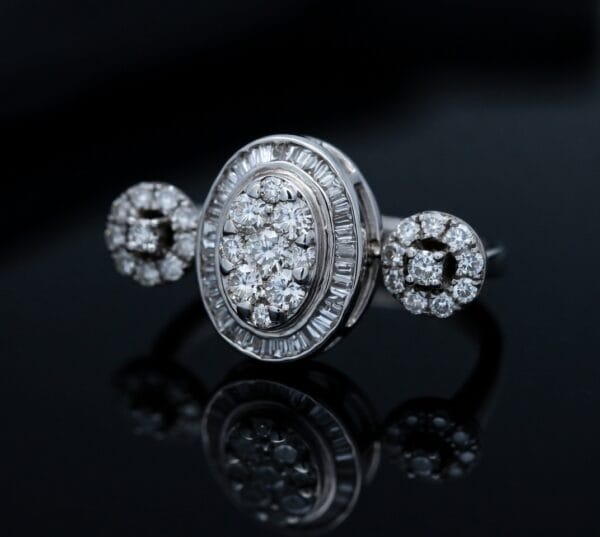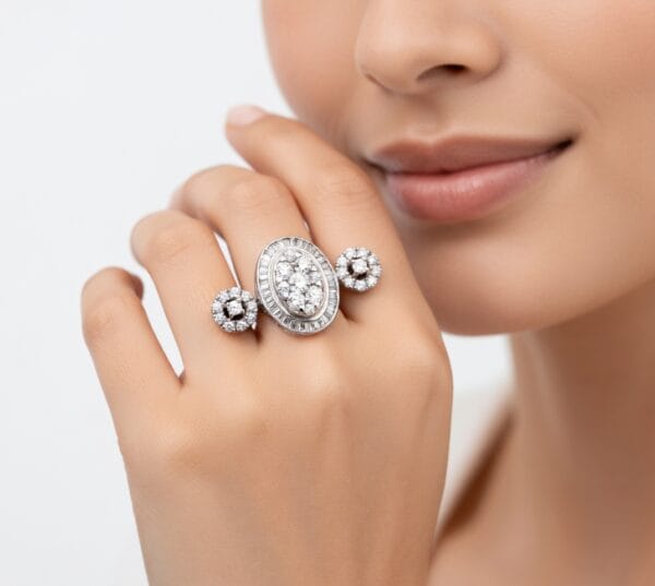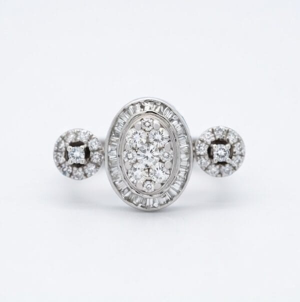 This refined 18K white gold ring showcases a striking three-stone composition with a central oval cluster of round and baguette diamonds, beautifully framed by a baguette halo. On either side, round diamond clusters add symmetry and extra sparkle, creating a harmonious and eye-catching design.