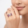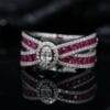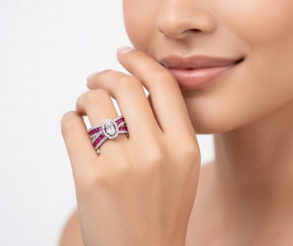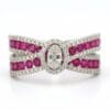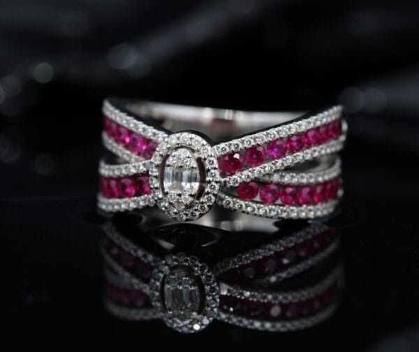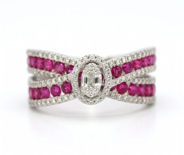 This striking 18K white gold ring showcases a modern crossover design with two rows of vivid ruby stones elegantly intertwined. The center is highlighted by a sparkling oval diamond cluster surrounded by pavé diamonds, creating a beautiful contrast between the deep red rubies and brilliant white diamonds.