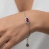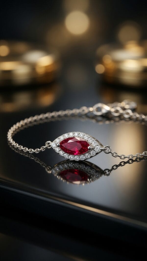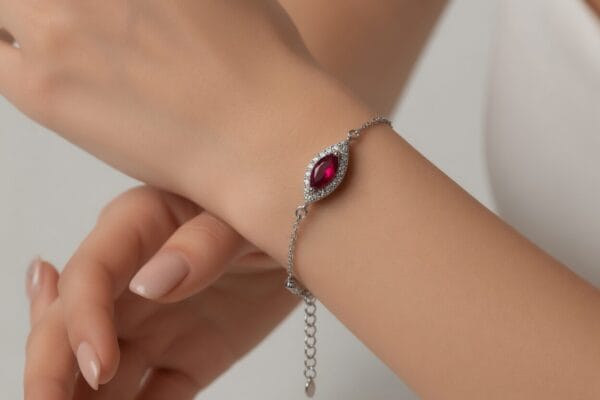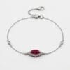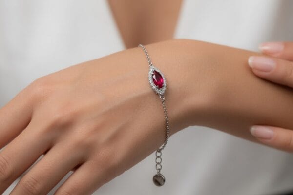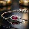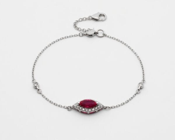 A timeless fusion of passion and sophistication. This 18K white gold bracelet centers on a vivid marquise-cut ruby (0.40 ct) that commands attention, elegantly framed by a halo of brilliant natural diamonds (0.14 ct total). The fine cable chain allows the pendant to move gracefully with every gesture, catching light beautifully.