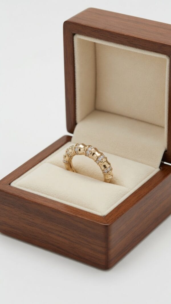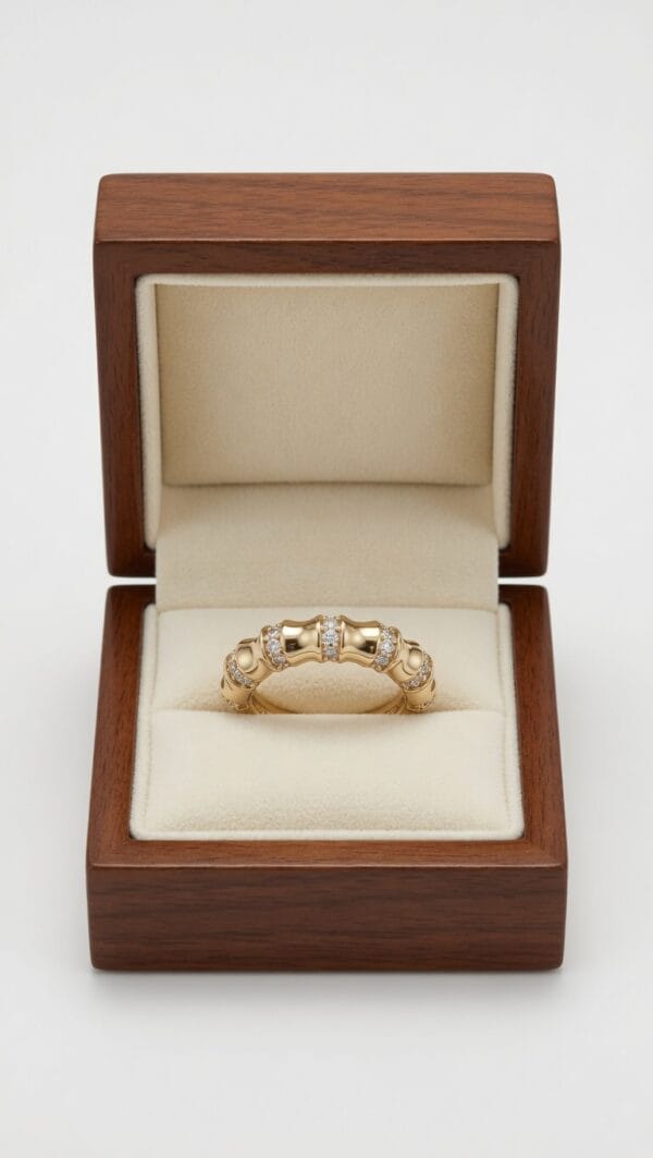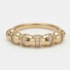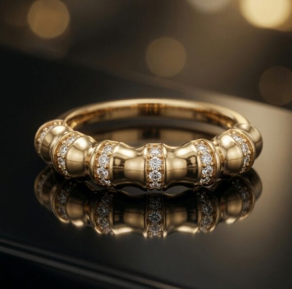 A sophisticated and versatile ring featuring a distinctive bamboo-inspired beaded shank adorned with glittering diamonds. This 18K yellow gold piece showcases a rhythmic pattern of polished gold beads accented with pavé-set diamonds, creating beautiful light play and elegant texture.