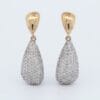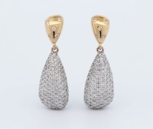 A perfect blend of modern glamour and classic elegance. These 18K yellow gold earrings showcase a smooth, polished yellow gold top accented with small brilliant diamonds, from which hangs a large, opulent teardrop fully encrusted with sparkling pavé diamonds.
