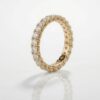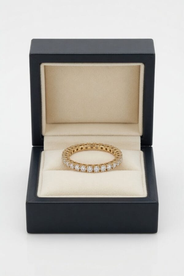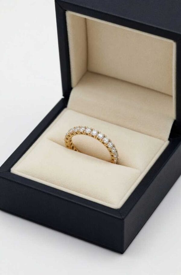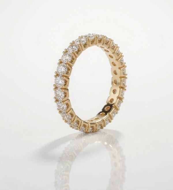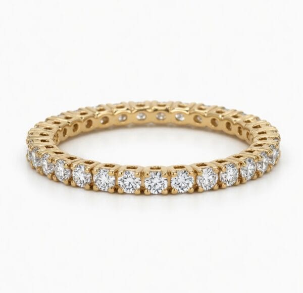 A classic eternity band that radiates elegance and sophistication. This 18K yellow gold ring is fully encircled with brilliant round diamonds in a secure pavé setting, creating continuous sparkle from every angle.