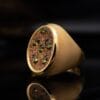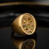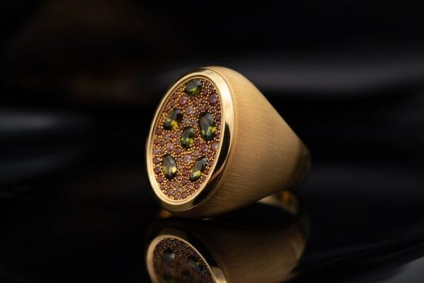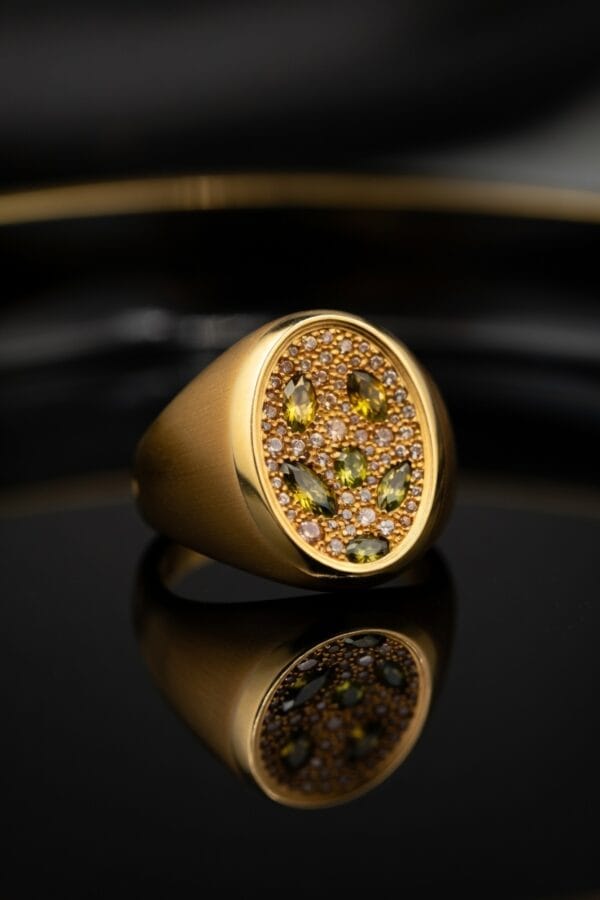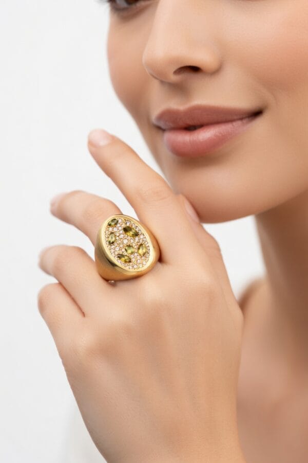 This striking 18K yellow gold ring showcases a large oval face adorned with a beautiful arrangement of yellow and green gemstones surrounded by delicate pavé detailing. The combination of larger faceted stones and smaller accents creates depth, sparkle, and rich color contrast against the warm gold background.