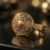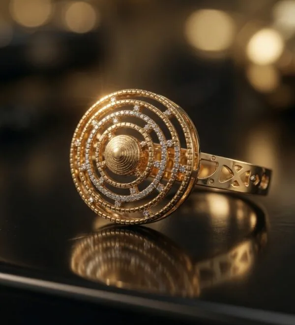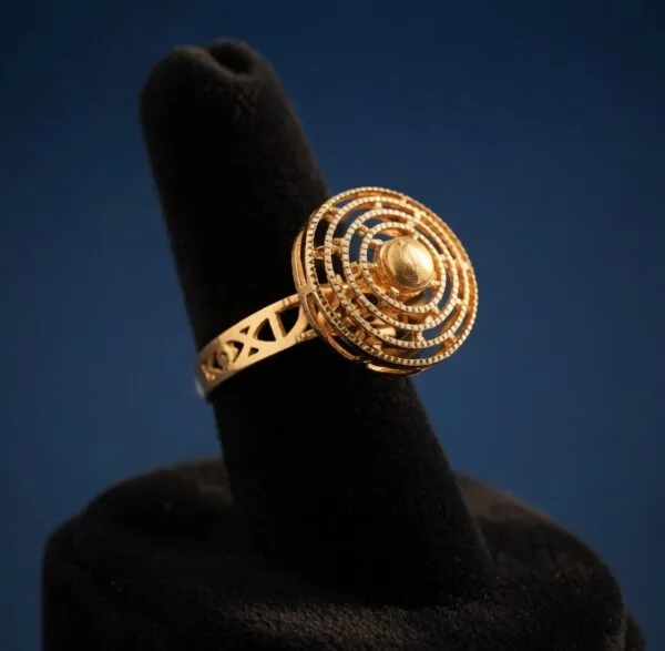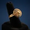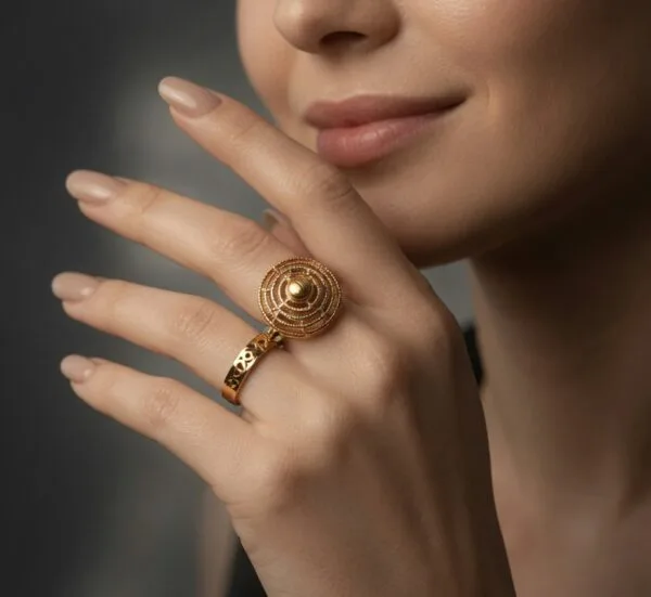 This refined 22K yellow gold ring showcases a beautiful circular design with multiple layers of fine concentric filigree surrounding a raised central dome. At a comfortable 3.02 grams, it provides a graceful presence while remaining light on the finger.