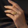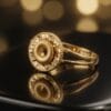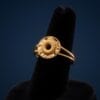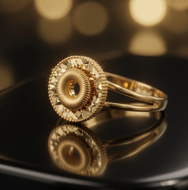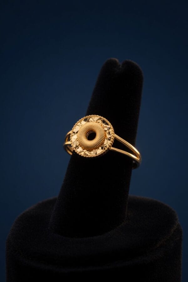 This refined 22K yellow gold ring showcases a striking circular motif with intricate concentric engraving and faceted textures that catch the light beautifully. Weighing a comfortable 2.64 grams, it provides a delicate yet noticeable presence on the finger.