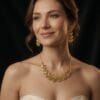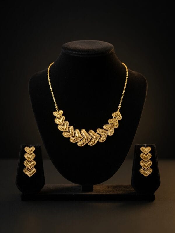 This charming 22K gold parure brings together traditional craftsmanship with modern femininity. The necklace (Ref: 22KGNK2177) showcases a beautiful repeating pattern of textured hearts and chevrons that cascade elegantly along the front, creating beautiful movement and light play. Weighing a refined 8.38 grams, it offers a comfortable yet noticeable presence.