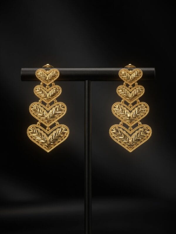 The matching earrings (Ref: 22KGER7323) feature stacked triple hearts with intricate detailing, weighing 2.75 grams for balanced wear. Together, this set delivers warm 22K gold radiance with a romantic, feminine touch — ideal for daily elegance, family gatherings, or special occasions.