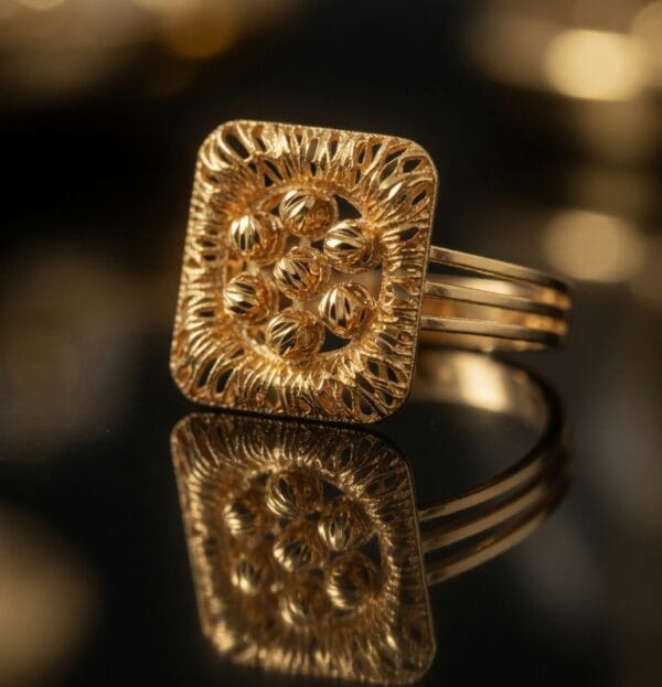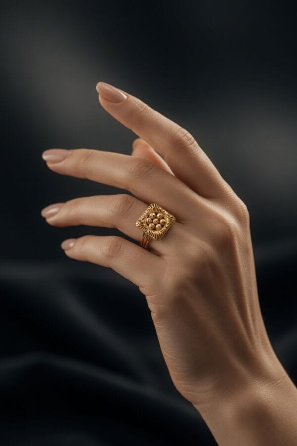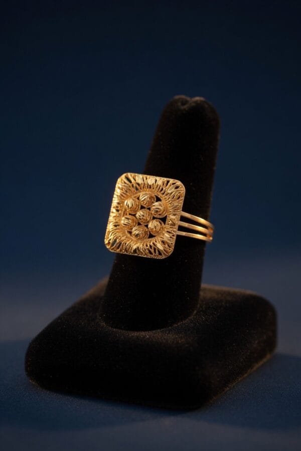 This beautiful 22K yellow gold ring features a square face adorned with fine openwork filigree and a cluster of textured beads at the center, creating a striking yet graceful design. At a comfortable 3.21 grams, it sits lightly on the finger while showcasing exceptional traditional goldsmithing.
