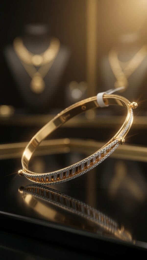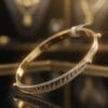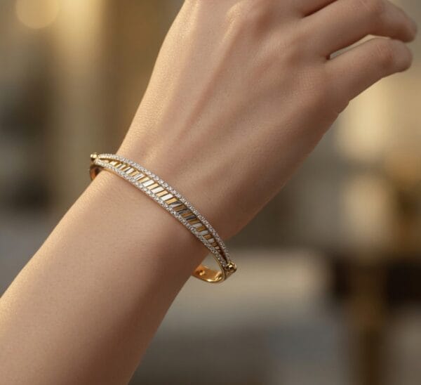 Expertly crafted in 22K yellow gold with contrasting white gold accents, this refined open cuff bangle showcases a striking geometric striped pattern enhanced by intricate micro-pavé detailing. The beautiful interplay of warm yellow gold and cool white gold creates depth and dimension, catching light beautifully with every movement. Weighing a comfortable 23.22 grams, this bangle combines substantial feel with lightweight wearability. Its open cuff design with elegant ball-end closures ensures easy on-and-off convenience while maintaining a secure and stylish fit. A versatile classic that complements both traditional and contemporary outfits — perfect for daily wear or special occasions.