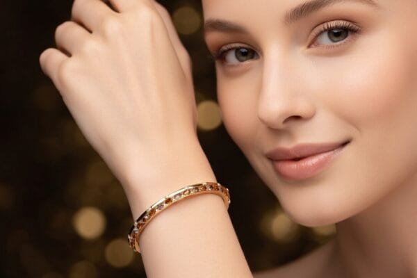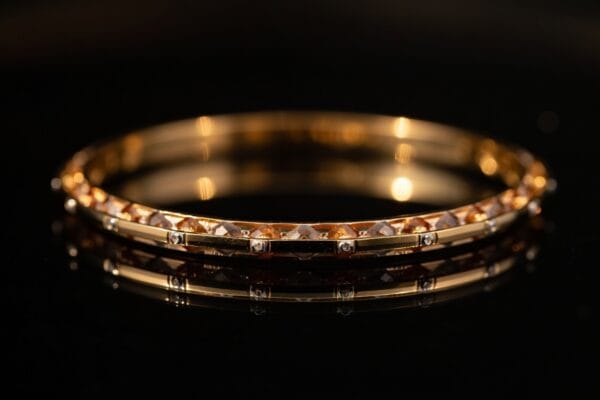 Masterfully crafted in rich 22K yellow gold, this exquisite bangle showcases a refined two-tone aesthetic with a smooth polished gold band elegantly contrasted by a row of precisely set faceted gemstones in warm amber and brilliant clear tones. The geometric pattern and diamond-cut details create beautiful depth and captivating light reflections with every movement.