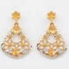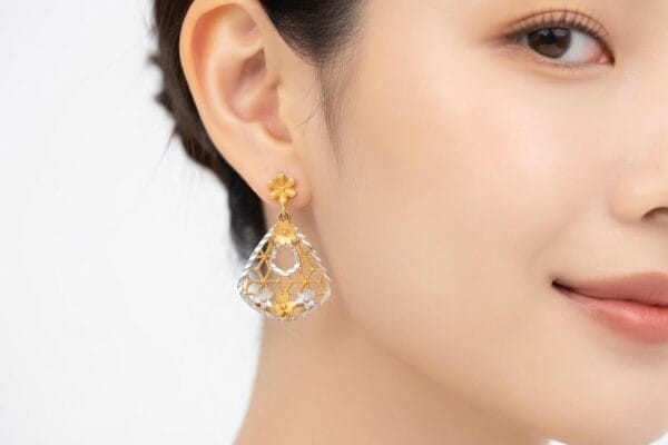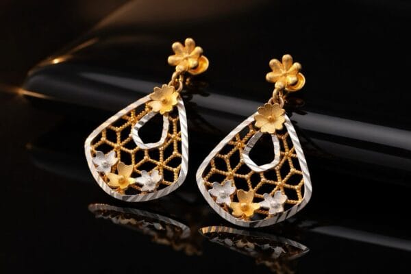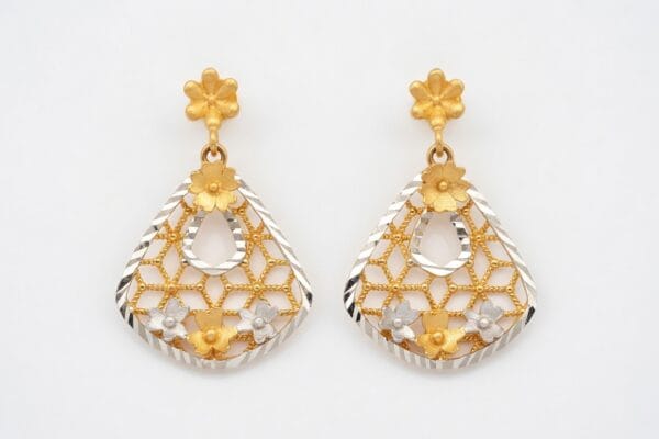 These charming 22K yellow gold earrings feature a beautifully crafted teardrop basket design with fine net patterning and elegant white gold accents. Adorned with delicate floral motifs at the top and bottom, they blend traditional craftsmanship with a modern, refined aesthetic.