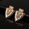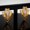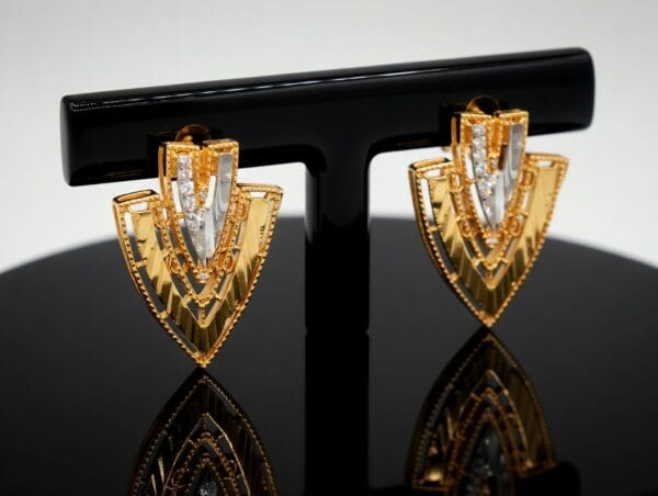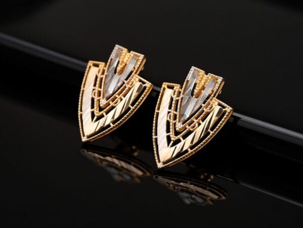 These refined 22K yellow gold earrings feature a sleek geometric shield design with intricate openwork details and elegant white gold accents in the middle sections. The petite stud size makes them perfect for everyday wear while maintaining a sophisticated two-tone contrast.
