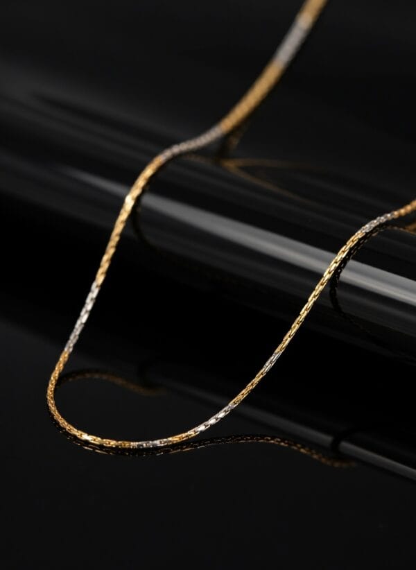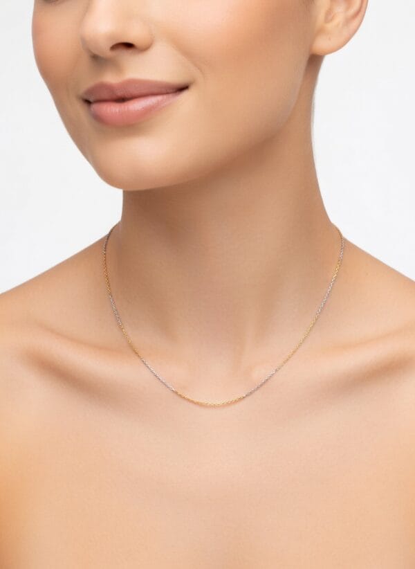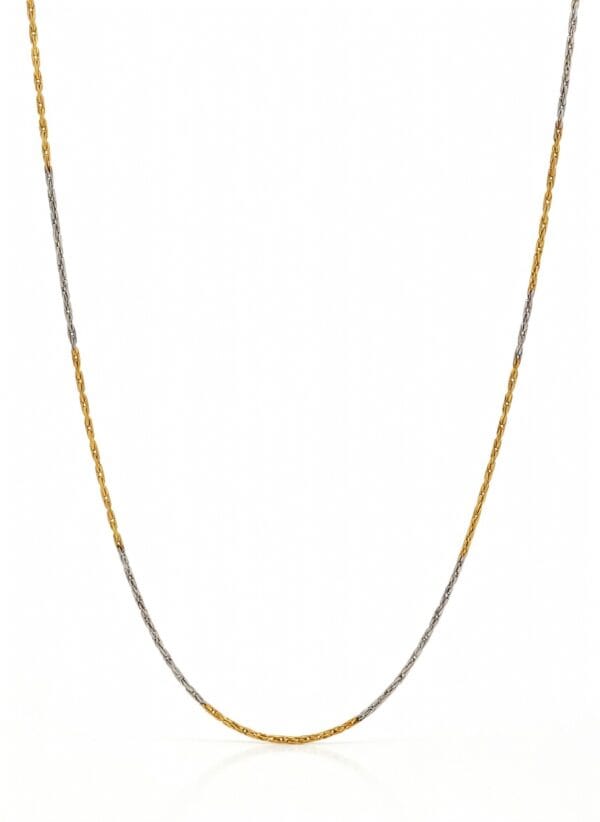 This refined 22K gold chain showcases a beautiful two-tone design with alternating sections of warm yellow gold and cool white gold. The fine, thin links create a lightweight and delicate appearance while maintaining excellent durability and shine.