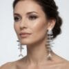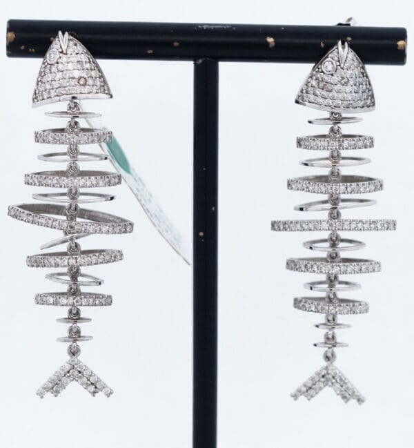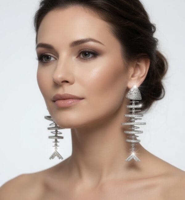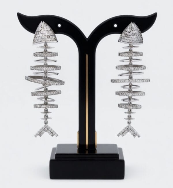 Inspired by the delicate structure of a fish skeleton, the design features a pavé-set triangular head, multiple articulated circular rings forming a flexible spine, and a graceful Y-shaped tail fin. The earrings gently sway and catch light beautifully, making them perfect for evening wear or adding a unique touch to any outfit.