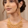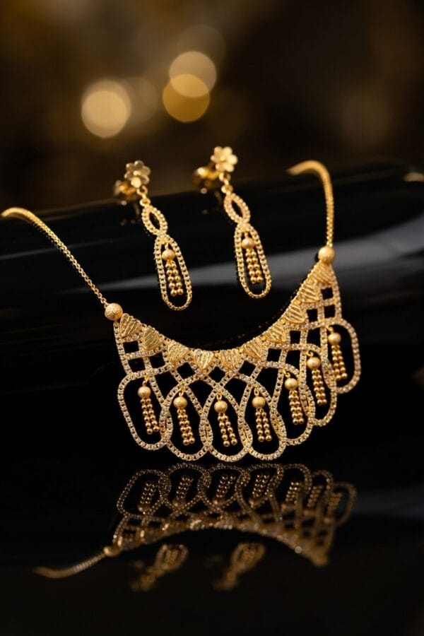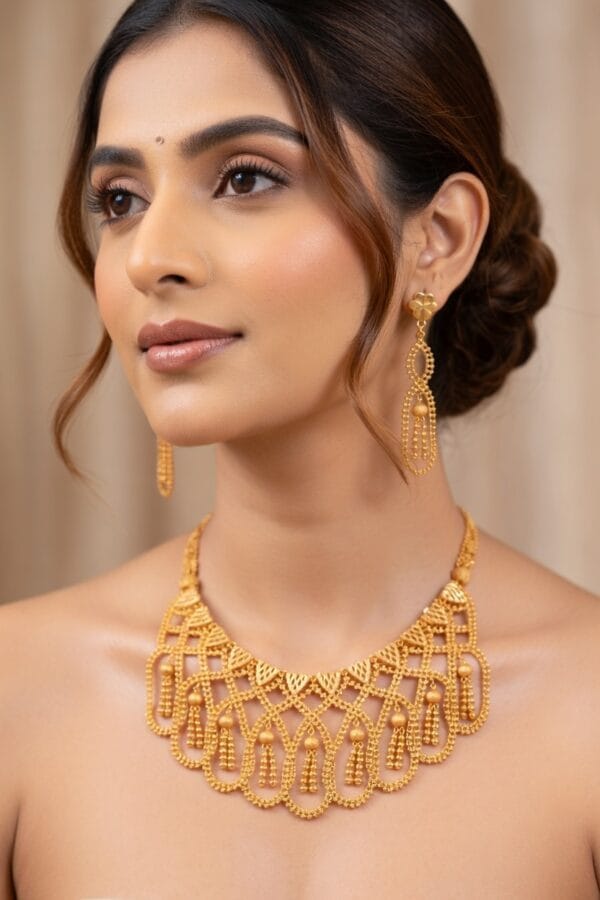 Intricately crafted in rich 22kt yellow gold, this stunning necklace and matching earrings set features delicate filigree lattice work with cascading tassels and traditional motifs. The lightweight yet opulent design combines classic South Indian craftsmanship with timeless elegance, making it perfect for weddings, festivals, and special occasions.