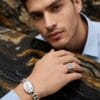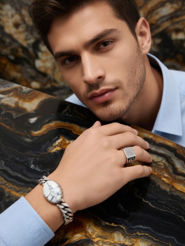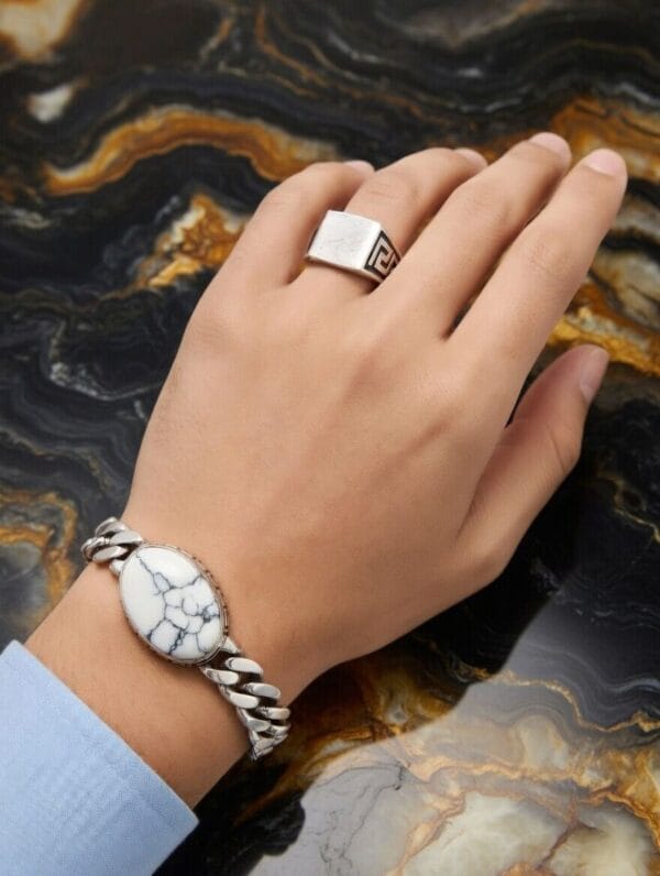 Elevate your everyday look with this bold and refined men’s silver jewelry set. Featuring a striking chunky link bracelet with a large natural White Howlite stone centerpiece and a sleek square signet ring with intricate Greek key detailing, this set exudes modern masculinity and timeless elegance.