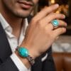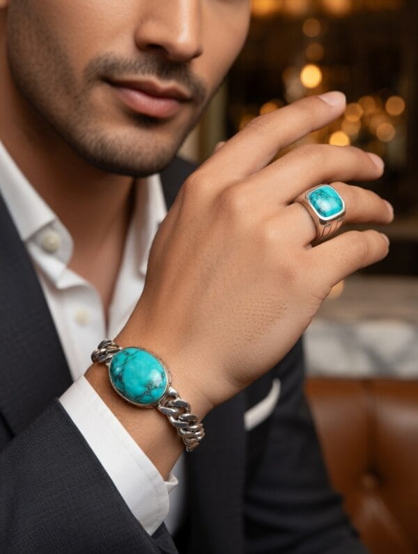 This masculine set includes a chunky curb-link bracelet centered with a large oval turquoise cabochon and a commanding square signet ring showcasing a vibrant turquoise stone with beautiful natural matrix veining. The rich blue-green turquoise contrasts elegantly against the high-polish sterling silver, creating a perfect balance of modern edge and timeless sophistication.