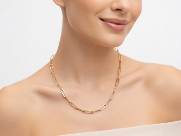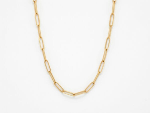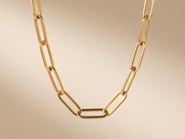 This sleek 22K yellow gold paperclip chain features elongated oval links that create a clean, contemporary look. Crafted from solid 22K gold, it offers the perfect balance of minimalist style and luxurious feel.