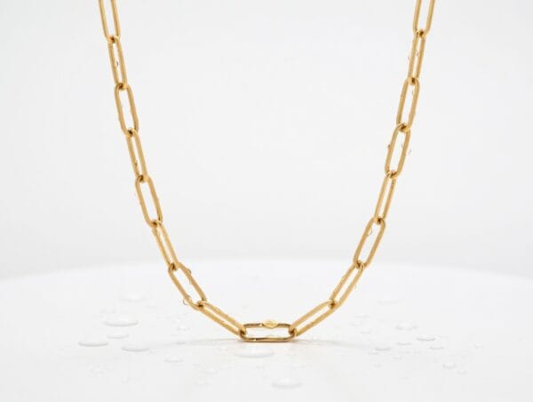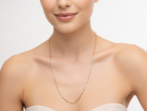 This beautifully crafted 22K yellow gold paperclip chain features elongated oval links in a sleek, minimalist design. Made from solid 22K gold, it offers exceptional lightness and comfort while delivering the rich warmth and luxury associated with high-purity gold.