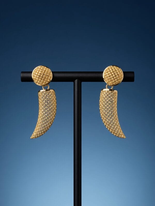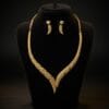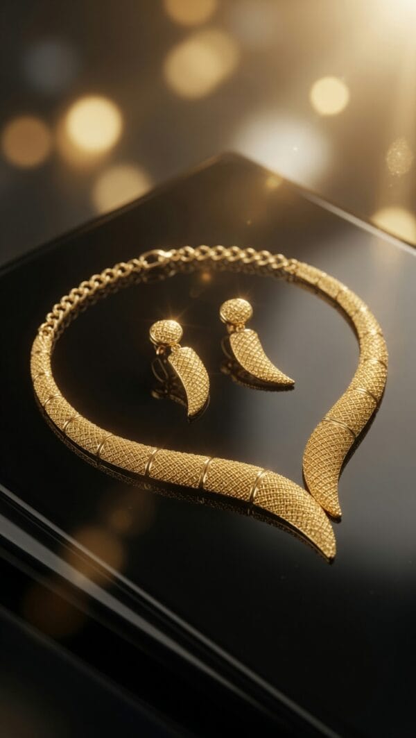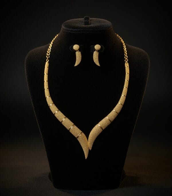 Paired with matching wing/leaf drop earrings that echo the same textured pattern and elegant curved shape, this set delivers timeless sophistication with a contemporary edge. Ideal for both everyday wear and special occasions, the rich 22K gold finish brings warmth and brilliance that enhances any outfit.