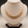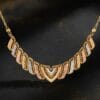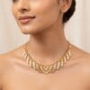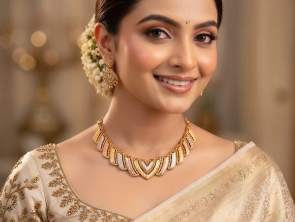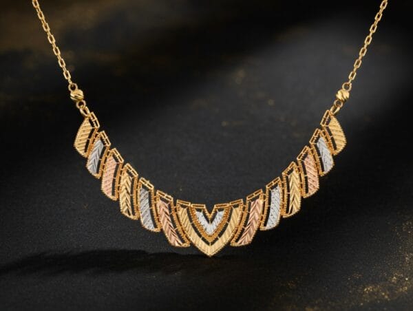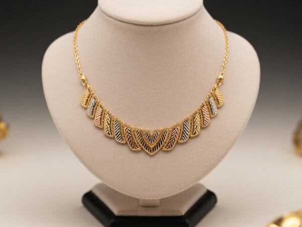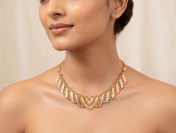 Crafted in luxurious 22K gold, the Trinity Verve Necklace showcases a modern interpretation of traditional artistry. The intricate openwork geometric pattern beautifully blends three harmonious gold tones — radiant yellow gold, warm rose gold, and cool white gold — creating a stunning tri-color effect that catches light from every angle.